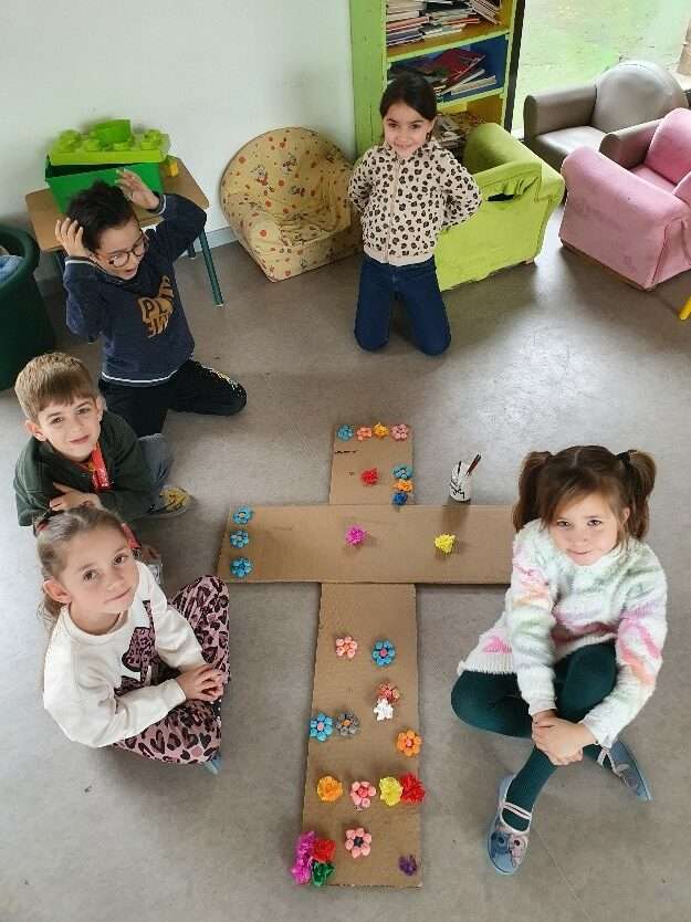Pour symboliser ce cheminement vers Pâques, les élèves de maternelle ont confectionné une croix. Celle-ci sera peu à peu recouverte de fleurs durant le Carême pour être entièrement fleuri le jour de Pâques et manifester la joie de la résurrection !