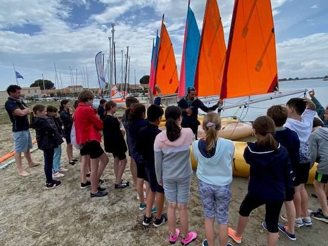 Départ pour la voile ; ils ont parcouru l’eau par trois sur des petits bateaux et ont été tantôt barreur, hisseur de voile et pagayeur sous les conseils du moniteur.