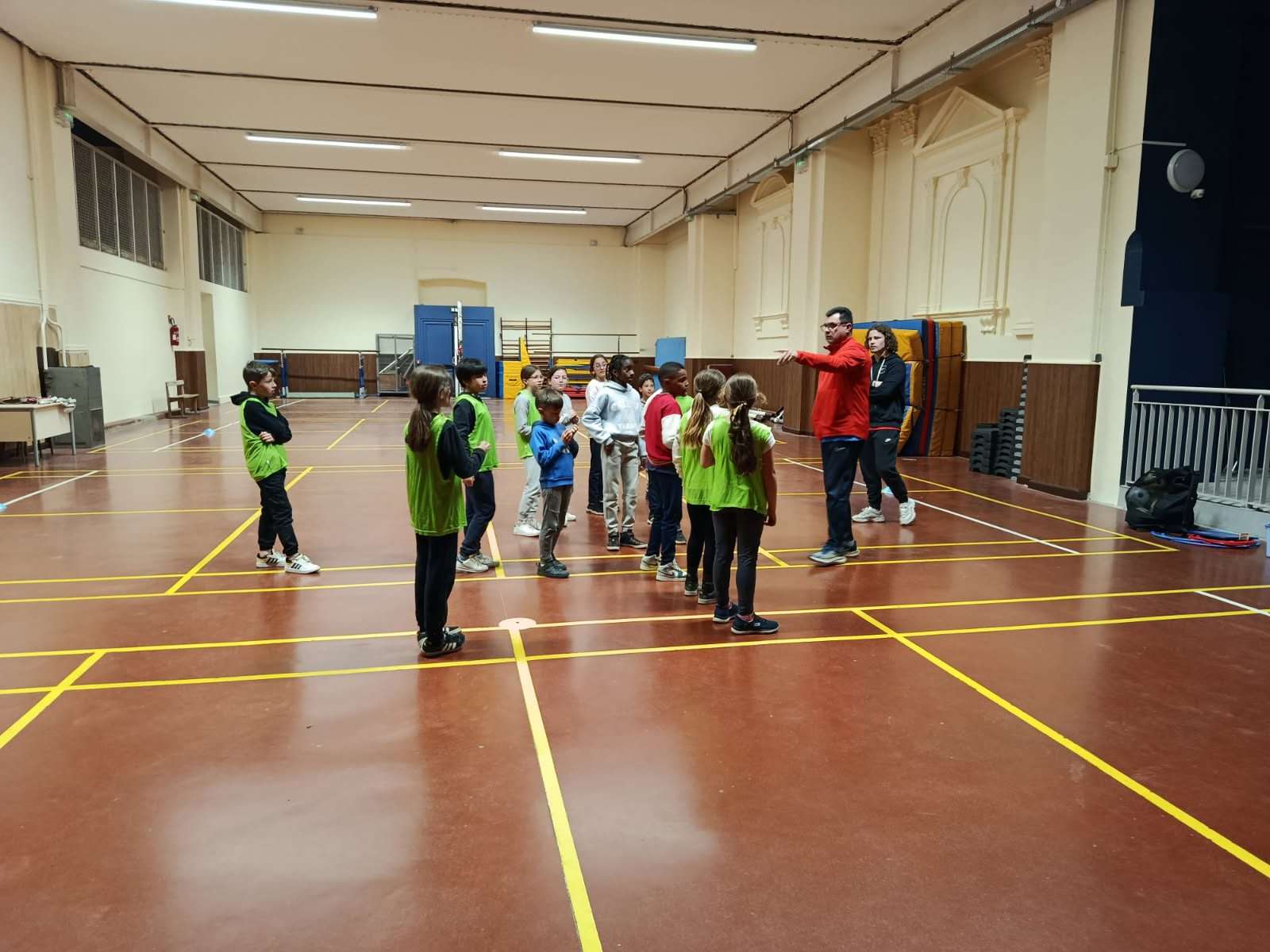Après une séance d’échauffement collective, les enfants ont participé, par petits groupes, à quatre ateliers sportifs : un lancer de poids, un parcours d’équilibre, une course en se tenant la main et un parcours de motricité.