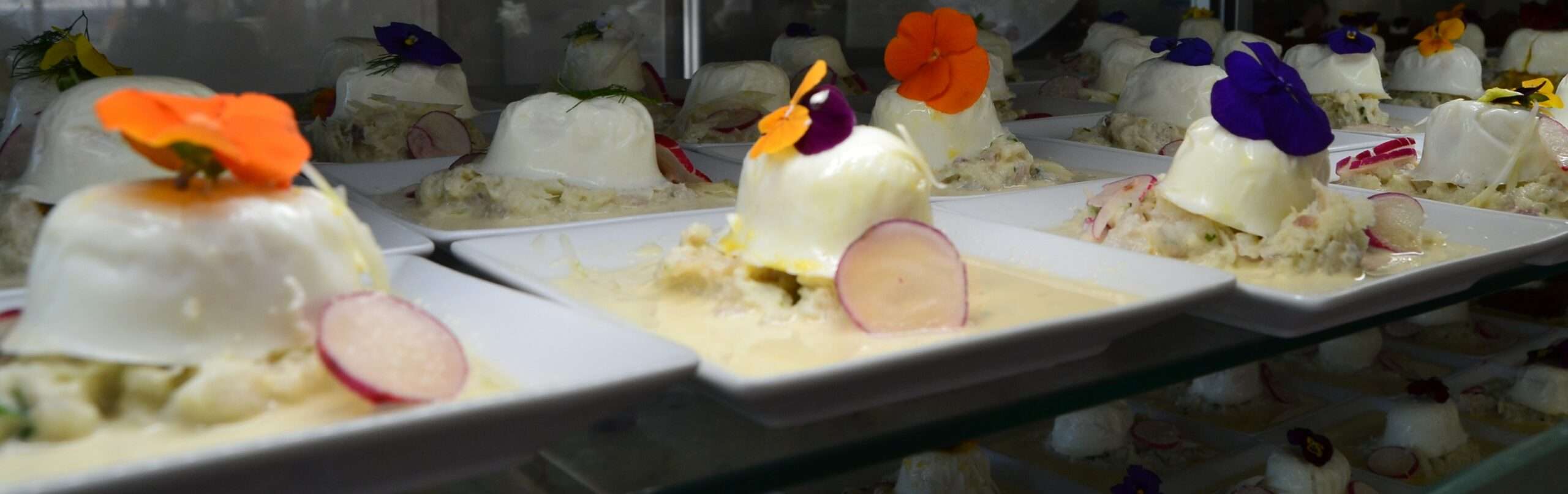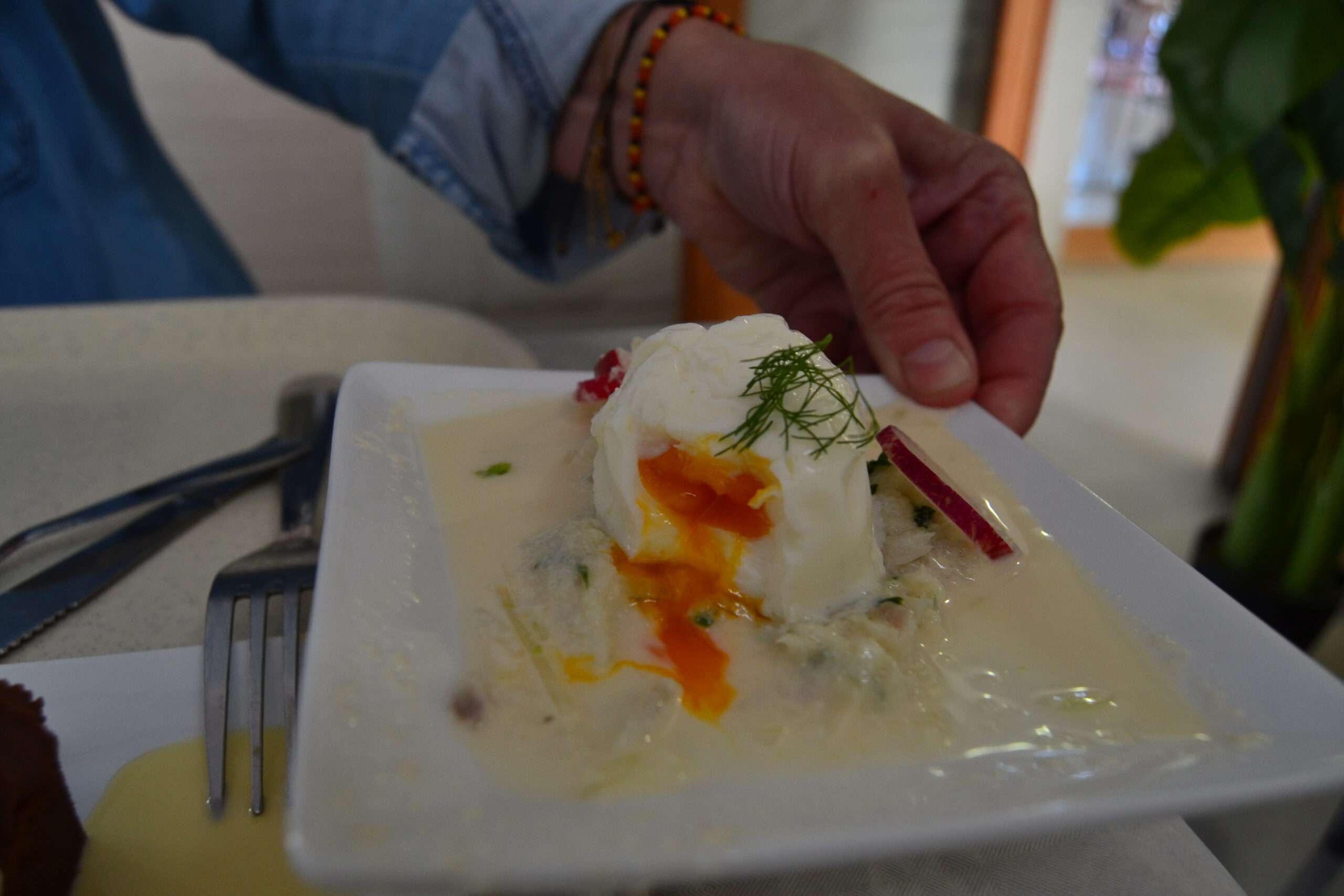 Entrée : rillette de poisson blanc avec œuf mollet accompagnée d’une sauce ceviche ;