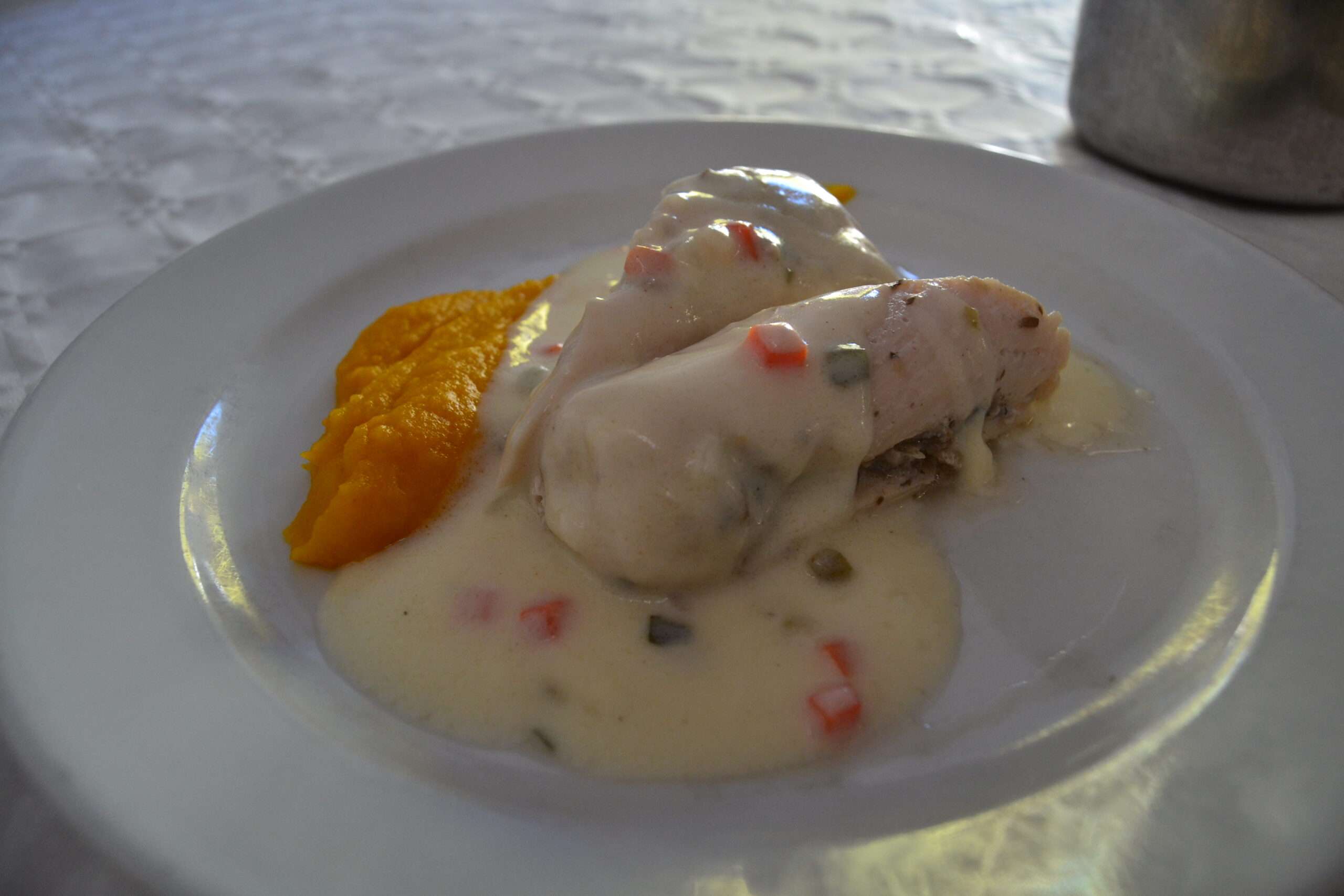 Plat : un suprême de volaille Duxelles de champignons accompagné d’une sauce blanquette et d’une purée de potimarron ;