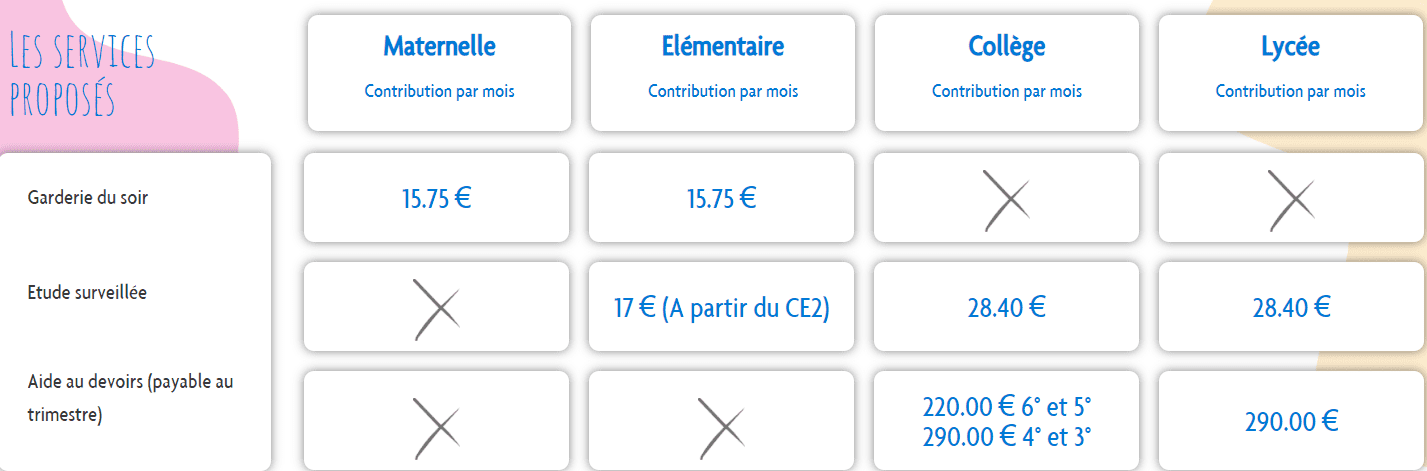 NB: Les activités sportives (piscine et musculation) et autres fournitures (tels les cahiers d’exercices) seront facturés en début d’année.